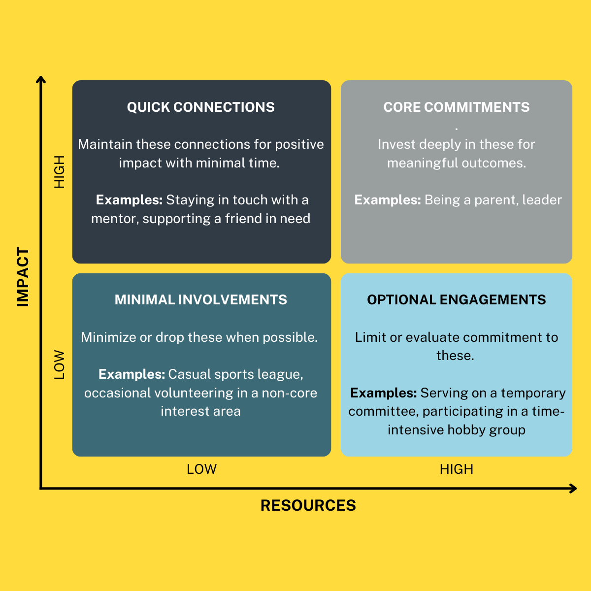 Roles Reflection- List out the top 10 roles you have (CXO, Parent, Spouse, Friend, Board Member, etc.). Think through how those roles fulfill you, and how they burden you. Create an Eisenhower Matrix, with one axis labelled “Impact”, Low to High, and the other labelled “Resources” (Low to High) Think through how much impact that role provides you (based on your own qualifications), and how much resources (time, energy, money) it takes. The higher the impact and the lower the resources, the better, but figure out which roles are no longer serving you, and how you can remove them.
